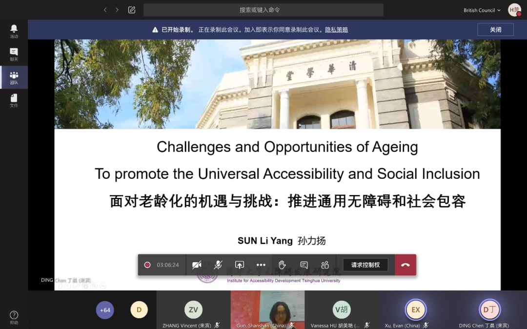 2020年6月11日-12日,清華大學無障礙發(fā)展研究院(以下簡稱“無障礙研究院”)受邀參與由英國文化教育協(xié)會和英國巴林基金會共同主辦的中英創(chuàng)意老齡化(線上)圓桌會議,并與來自倫敦大學失智癥研究中心、蘇格蘭芭蕾舞團、利物浦國家博物館等多位嘉賓進行了交流,分享創(chuàng)意老齡化領(lǐng)域的探索與實踐。會議由英國文化教育協(xié)會郭姍姍女士主持。