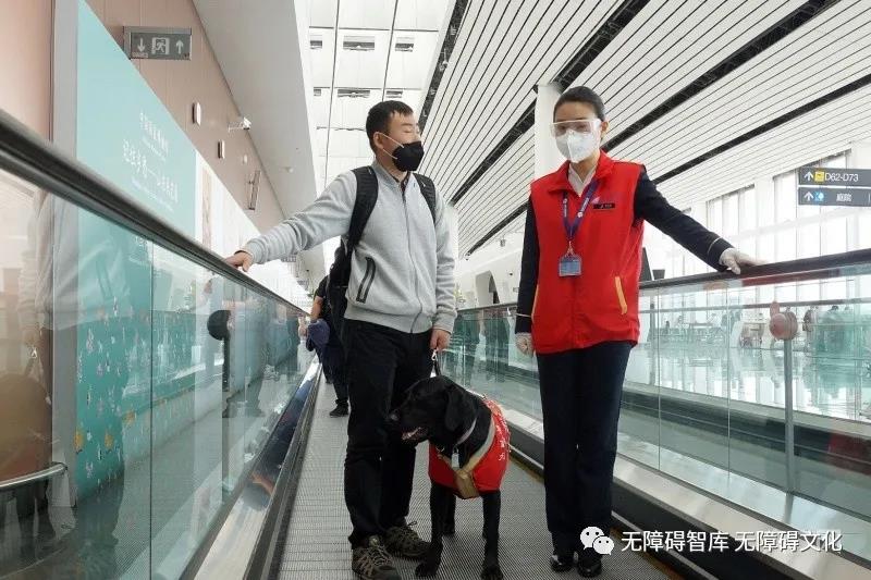 資料圖:視障人士呂先生和導盲犬Black以及中國導盲犬大連培訓基地的工作人員,共同乘坐CZ6129航班從大連出發(fā)飛往北京大興國際機場(圖片來源:CFP)