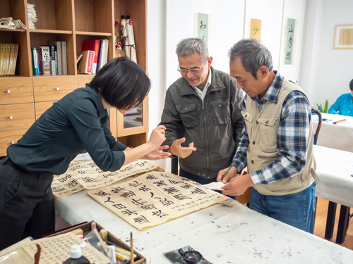 在點(diǎn)評(píng)環(huán)節(jié),大家迫不及待拿出自己的作品請(qǐng)鄭老師指導(dǎo)。鄧阿姨第一個(gè)展示了自己的作品,一幅臨摹趙孟頫《道德經(jīng)》的小楷書(shū)法。“你的毛筆不大好,作品布局留白不夠勻稱(chēng),整幅作品還是有很大進(jìn)步空間?!编嵗蠋熤锌系狞c(diǎn)評(píng),不僅沒(méi)有讓鄧阿姨氣餒,反而更是增加了學(xué)習(xí)熱情。鄧阿姨表示,從退休前自己就開(kāi)始練習(xí)小楷,平時(shí)很少有機(jī)會(huì)可以和專(zhuān)業(yè)老師交流,她覺(jué)得自己來(lái)得很值!
