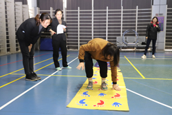 首先開始的項目是“手腳并用”。該項目要求參賽隊員手腳配合快速通過地面噴繪圖上的難關。在噴繪圖上交錯標著手腳部位,參賽隊員只能用對應的手腳去接觸,按指定線路前進,不能跳格,看誰最短時間到達終點。這是一個考驗反應能力和肢體協(xié)調性的項目,一些參賽員工出現(xiàn)了手足亂放的尷尬狀態(tài),令周圍觀眾捧腹大笑。會籍部的吳冉冉手腳靈敏,身體輕盈,僅用13秒就順利通關。