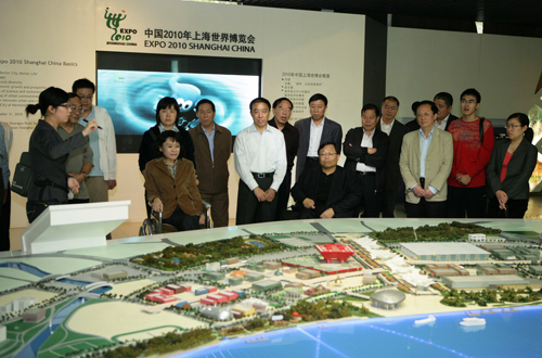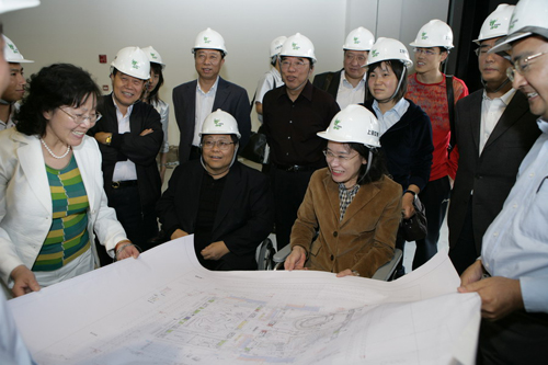 圖為中國殘聯(lián)主席張海迪一行視察世博會生命陽光館時(shí)觀看設(shè)計(jì)圖紙