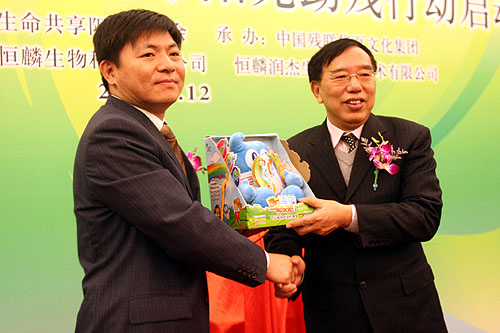2010年1月12日,由中國殘聯(lián)華夏文化集團(tuán)文化助殘辦公室和恒麟生物科技有限公司聯(lián)合發(fā)起的“喝彩世博,共享陽光-‘七彩帶’恒麟關(guān)愛陽光助殘行動(dòng)”在人民大會(huì)堂啟動(dòng)。中國殘聯(lián)黨組副書記、常務(wù)副理事長、世博中國關(guān)愛生命共享陽光組委會(huì)副主席王乃坤,中國殘聯(lián)副主席、黨組成員、世博中國關(guān)愛生命共享陽光組委會(huì)秘書長呂世明,世博中國關(guān)愛生命共享陽光組委會(huì)副秘書長王智鈞,上海世博會(huì)生命陽光館館長曹子平,中國殘聯(lián)華夏文化集團(tuán)總裁、世博中國關(guān)愛生命共享陽光組委會(huì)辦公室副主任梁本遠(yuǎn),中國殘聯(lián)組聯(lián)部、康復(fù)部、中國殘聯(lián)華夏文化集團(tuán)文化助殘辦公室、組委會(huì)市場部的有關(guān)領(lǐng)導(dǎo),以及恒麟生物科技有限公司董事長王翡、總經(jīng)理黃長山等出席啟動(dòng)儀式。