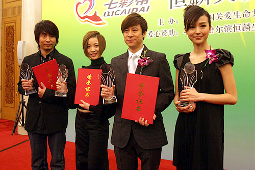 著名歌手解小東代表所有愛心人士宣讀了 “七彩帶”倡議書。譚晶、解小東、秦海璐、沙寶亮、趙保樂、姚星彤、姚貝娜、謝映玲、張亞東等分別被聘為上海世博會(huì)生命陽光館愛心大使及“七彩帶”陽光助殘行動(dòng)的陽光天使。