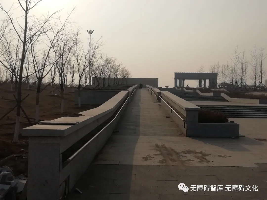 正門兩側(cè)對稱建有無障礙通道。坡道采用折返二段式,可到達“大連門”上方的平臺,也就是“中軸線”的最高位置。站在這里,可以俯瞰公園,可頓生“面朝大海,春暖花開了”的感覺。兩側(cè)坡道建得大氣,寬度坡度符合規(guī)范,只是單側(cè)扶手略有遺憾。