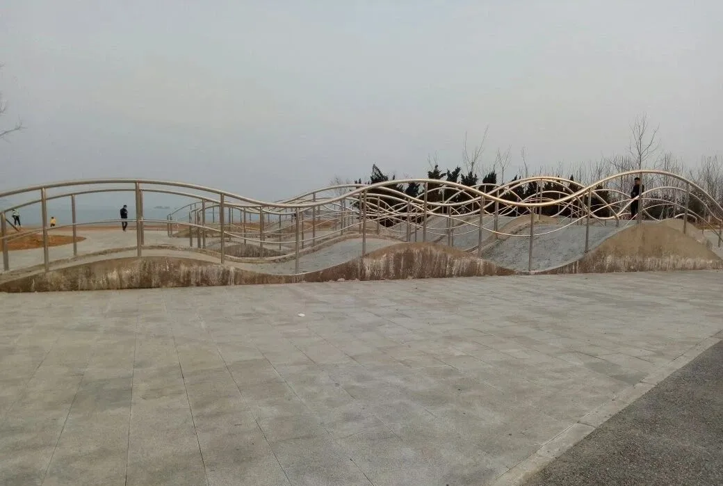 來到海邊,人們不僅要“望洋興嘆”,更主要的是想與大海有一個近距離的親密接觸,輪行者也可遠觀也可近游,這一點設(shè)計者都想到了。從“大連門”到海邊有近百米的距離,而且是一個下行的山坡。設(shè)計者把中間設(shè)計為非常人性化地平緩寬大的臺階,兩側(cè)設(shè)計了五層寬松的無障礙通道,每層級有一個休息平臺,由于寬度坡度均符合無障礙標準,輪行者自如,步行者方便,能滿足未來大客流時各類人的進出需求。長坡道和寬臺階,可因人所好自由選擇。臺階和坡道都很舒緩,中軸線兩側(cè)是對稱的長坡道,設(shè)計完美,體驗舒適,只是困為趕進度施工有些粗糙。