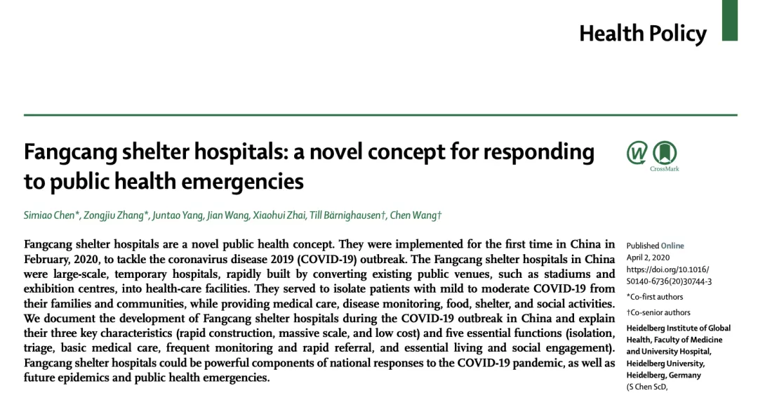 值得一提的是,在舉行這場(chǎng)研討會(huì)之前的當(dāng)?shù)貢r(shí)間4月2日,全球頂級(jí)醫(yī)學(xué)期刊《柳葉刀》(The Lancet)在線發(fā)表了一篇聚焦中國(guó)建設(shè)和啟用方艙醫(yī)院(Fangcang shelter hospitals )的文章。該文章由王辰團(tuán)隊(duì),以及德國(guó)海德堡大學(xué)全球公共衛(wèi)生研究所等團(tuán)隊(duì)共同完成,王辰為該文章的通訊作者。