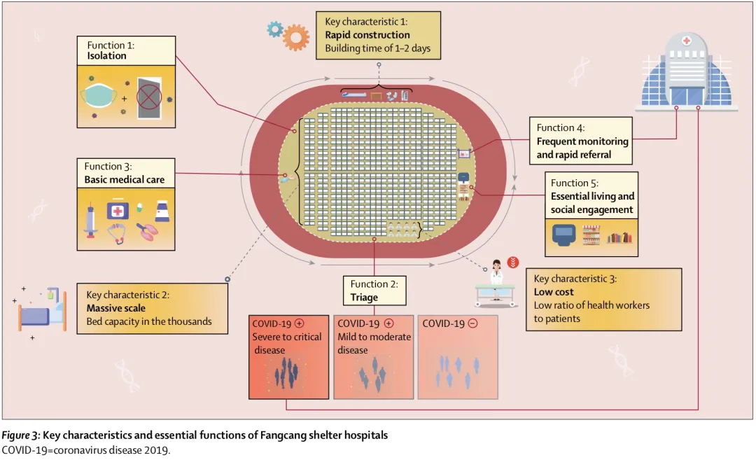 除了上述三大特點(diǎn)之外,作者們還總結(jié)了方艙醫(yī)院的五個(gè)基本功能。