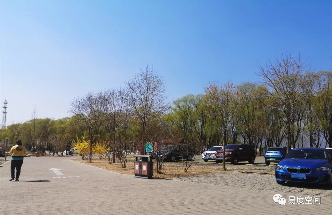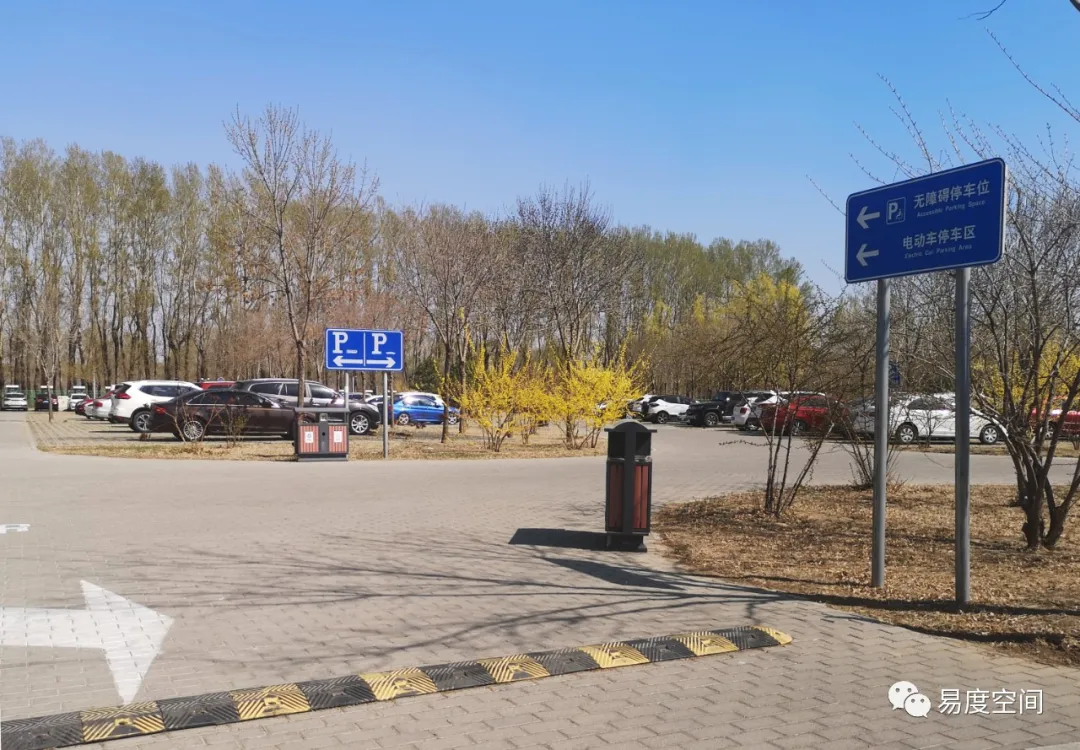 公園入口位于濕地東南側(cè),門前道路南邊設(shè)停車場(chǎng)。停車場(chǎng)出入口處立有明確的無(wú)障礙停車位位置指示牌,與其他公園的停車場(chǎng)相比,這一點(diǎn)是比較難能可貴的。