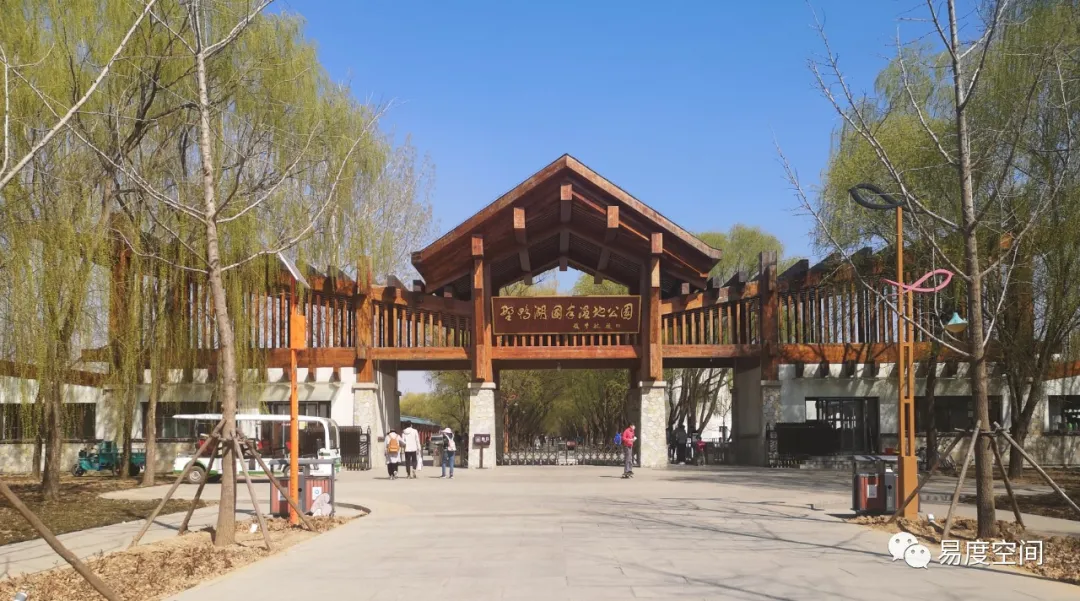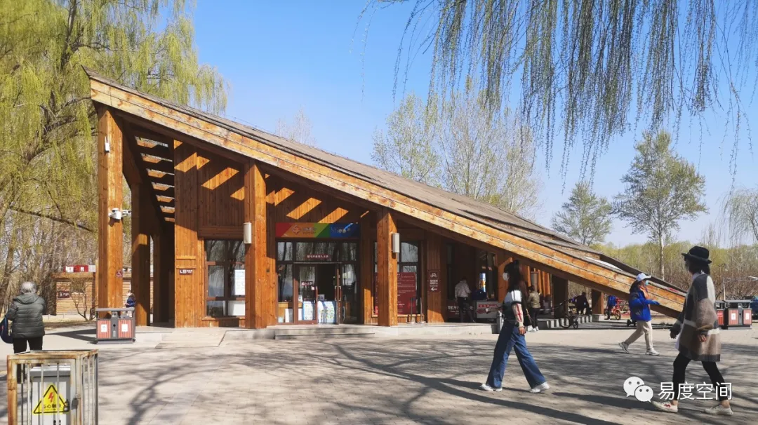 公園入口為木質(zhì)兩坡屋頂造型,二層穿插連廊,氣勢(shì)雄偉。大門兩側(cè)的公廁和服務(wù)用房均設(shè)置了無(wú)障礙坡道。大門人行閘口寬度足夠,道路平坦,不會(huì)對(duì)游人形成任何障礙。