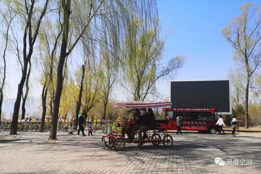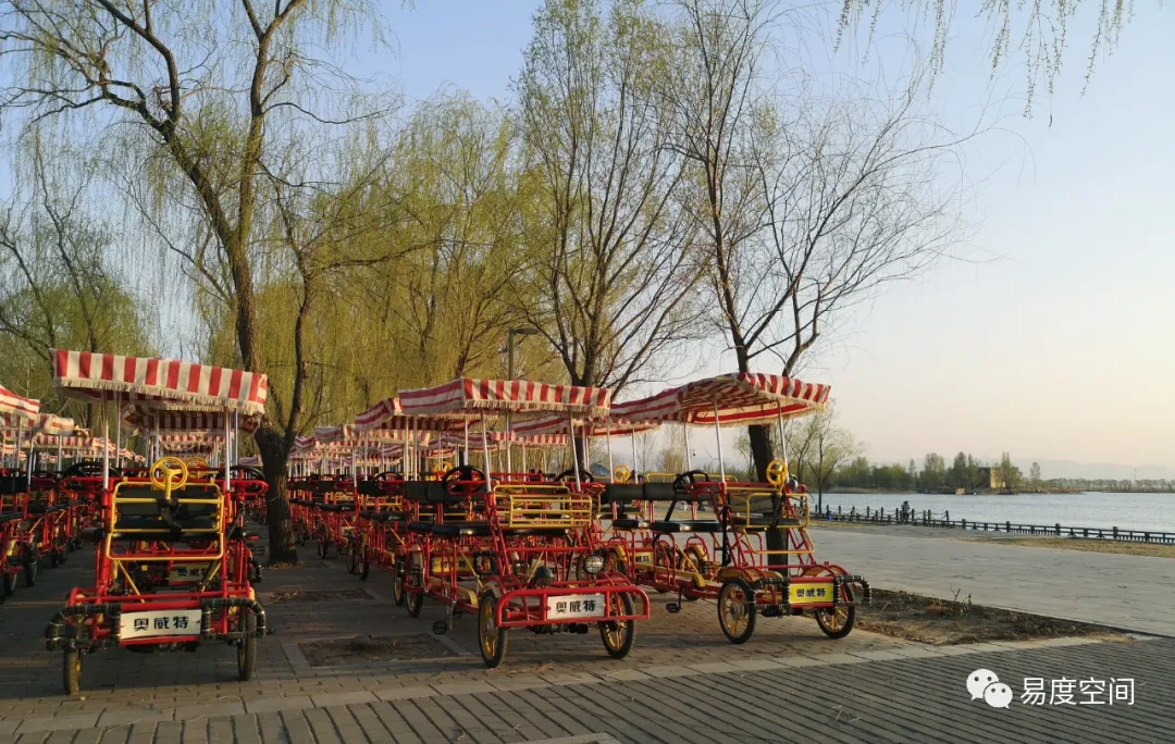 道路盡頭抵達(dá)野鴨湖畔。湖畔廣場(chǎng)上停放了大量的多人自行車,東北側(cè)游客服務(wù)中心與公共廁所門前都進(jìn)行了坡化處理。