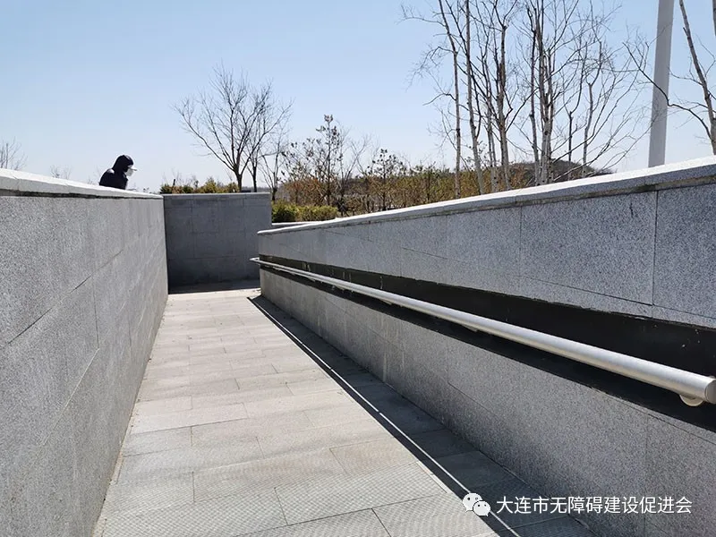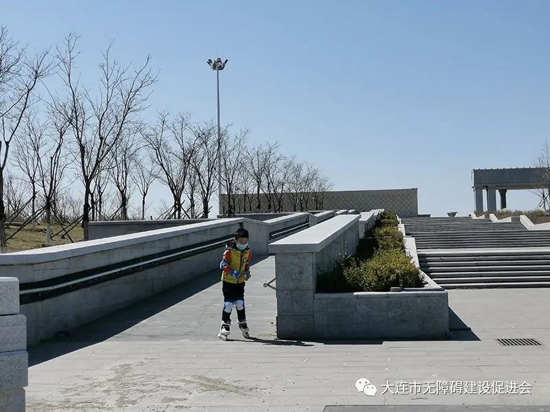 (一)園路構(gòu)成多循環(huán)的閉合無(wú)障礙系統(tǒng)。主要體現(xiàn)為兩個(gè)特點(diǎn):1、臺(tái)階或梯道處必有無(wú)障礙坡道。比如,在航海主題公園的主出入口,佇立著微縮版的大連港客運(yùn)站半圓形的玄關(guān)(原建筑2013年已被拆散)。在玄關(guān)兩側(cè)分別修建了兩層折疊式無(wú)障礙坡道(原建筑沒(méi)有坡道)。公園設(shè)計(jì)考慮到無(wú)障礙需求,在兩側(cè)較為含蓄地設(shè)置了無(wú)障礙坡道——既沒(méi)有破壞原建筑的風(fēng)貌,又為傳統(tǒng)設(shè)計(jì)增加了現(xiàn)代意義。2、無(wú)障礙坡道通達(dá)處皆可通過(guò)平緩下降的園路從另一端通達(dá),即:每個(gè)局部都可以構(gòu)成無(wú)障礙環(huán)路。比如:在蝸牛橋附近的出入口,我們可通過(guò)無(wú)障礙坡道進(jìn)入濱海步道,也可以沿著緩坡、通過(guò)園路到達(dá)同一地點(diǎn)——游客既可通過(guò)輪椅坡道較為快速地到達(dá)濱海步道,也可通過(guò)緩慢降低的園路進(jìn)入濱海步道。非單線閉合的局部微循環(huán)與整體大循環(huán)相結(jié)合,在大連其他公園中則極為罕見(jiàn)。大多數(shù)公園最多只修建一條單線的無(wú)障礙園路,既不能構(gòu)成環(huán)路,也不能形成系統(tǒng)。目前該公園尚處于建設(shè)階段,但預(yù)估園區(qū)的通達(dá)率至少在95%以上。