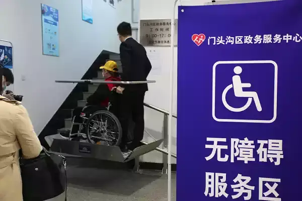 乘坐輪椅的肢體殘疾人體驗(yàn)政務(wù)服務(wù)中心無障礙升降設(shè)備椅(央廣網(wǎng)發(fā) 北京市殘聯(lián)供圖)