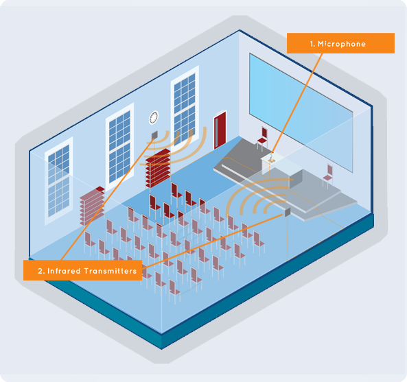 紅外線(xiàn)系統(tǒng)由一個(gè)發(fā)射器和接收器組成,介質(zhì)是不可見(jiàn)光。發(fā)射器發(fā)出由光波組成的信號(hào),在整個(gè)房間內(nèi)傳播。光的波長(zhǎng)在人類(lèi)所能看到的范圍之外。這些光波攜帶著來(lái)自聲源的信息,被用戶(hù)佩戴的接收器接收到。紅外線(xiàn)系統(tǒng)可以使用特定的耳機(jī),其接收器也可以與用戶(hù)自己的助聽(tīng)設(shè)備“T檔”配合使用。紅外線(xiàn)系統(tǒng)是無(wú)線(xiàn)的,對(duì)廣播、電視、音響、音樂(lè)會(huì)、講座和劇院都有很好的保真效果。然而,基于光的工作原理,紅外信號(hào)必須控制在發(fā)射器安裝的空間內(nèi)。