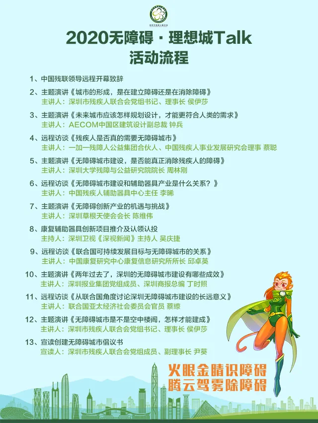 2020無(wú)障礙·理想城Talk 共話無(wú)障礙 共建理想城 共享全世界 為慶祝第三十次全國(guó)助殘日,攜手殘疾人共創(chuàng)美好新生活,深圳市殘疾人聯(lián)合會(huì)將于2020年5月17日舉行“無(wú)障礙·理想城Talk”活動(dòng)。貫徹深圳創(chuàng)建無(wú)障礙城市的方針,宣傳無(wú)障礙理念文化政策,動(dòng)員全社會(huì)參與無(wú)障礙城市建設(shè)。 活動(dòng)上,中國(guó)殘疾人輔助器具中心主任李晞、中國(guó)康復(fù)研究中心康復(fù)信息研究所所長(zhǎng)邱卓英、中國(guó)殘疾人事業(yè)發(fā)展研究會(huì)理事蔡聰、聯(lián)合國(guó)亞太經(jīng)濟(jì)社會(huì)委員會(huì)官員蔡縩等嘉賓將以遠(yuǎn)程訪談的形式參與活動(dòng)。 深圳市殘聯(lián)理事長(zhǎng)侯伊莎、深圳商報(bào)總編丁時(shí)照、深圳大學(xué)殘障與公益研究院院長(zhǎng)周林剛、草根天使會(huì)會(huì)長(zhǎng)陳維偉、AECOM中國(guó)區(qū)建筑設(shè)計(jì)副總裁鐘兵等將現(xiàn)場(chǎng)出席活動(dòng)并進(jìn)行主題演講。 活動(dòng)由深圳衛(wèi)視知名主持吳慶捷擔(dān)任主持人。 2 活動(dòng)流程 活動(dòng)將圍繞著無(wú)障礙城市的理念、無(wú)障礙城市的建設(shè)路徑、無(wú)障礙創(chuàng)新產(chǎn)業(yè)的發(fā)展,無(wú)障礙城市的未來(lái)等議題展開(kāi),將探討城市與人的關(guān)系、城市應(yīng)該怎樣規(guī)劃設(shè)計(jì)、殘疾人是否真的需要無(wú)障礙城市、兩年來(lái)無(wú)障礙城市建設(shè)有何進(jìn)展、無(wú)障礙城市應(yīng)該怎樣建設(shè)等熱點(diǎn)話題。 中國(guó)殘聯(lián)領(lǐng)導(dǎo)遠(yuǎn)程開(kāi)幕致辭 主題演講《城市的形成,是在建立障礙還是在消除障礙》主講人:深圳市殘疾人聯(lián)合會(huì)黨組書(shū)記、理事長(zhǎng) 侯伊莎 主題演講《未來(lái)城市應(yīng)該怎樣規(guī)劃設(shè)計(jì),才能更符合人類(lèi)的需求》主講人:AECOM中國(guó)區(qū)建筑設(shè)計(jì)副總裁 鐘兵 遠(yuǎn)程訪談《殘疾人是否真的需要無(wú)障礙城市》主講人:一加一殘障人公益集團(tuán)合伙人、中國(guó)殘疾人事業(yè)發(fā)展研究會(huì)理事 蔡聰 主題演講《無(wú)障礙城市建設(shè),是否能真正消除殘疾人的障礙》主講人:深圳大學(xué)殘障與公益研究院院長(zhǎng) 周林剛 遠(yuǎn)程訪談《輔助器具產(chǎn)業(yè)與無(wú)障礙城市是什么關(guān)系?》主講人:中國(guó)殘疾人輔助器具中心主任 李晞 主題演講《無(wú)障礙創(chuàng)新產(chǎn)業(yè)的機(jī)遇與挑戰(zhàn)》主講人:深圳草根天使會(huì)會(huì)長(zhǎng) 陳維偉 康復(fù)輔助器具創(chuàng)新項(xiàng)目推介及認(rèn)領(lǐng)認(rèn)投主持人:深圳衛(wèi)視《深視新聞》主持人 吳慶捷 遠(yuǎn)程訪談《聯(lián)合國(guó)可持續(xù)發(fā)展目標(biāo)與無(wú)障礙城市的關(guān)系》主講人:中國(guó)康復(fù)研究中心康復(fù)信息研究所所長(zhǎng) 邱卓英 主題演講《兩年過(guò)去了,深圳的無(wú)障礙城市建設(shè)有哪些成效》主講人:深圳報(bào)業(yè)集團(tuán)黨組成員、深圳商報(bào)總編 丁時(shí) 遠(yuǎn)程訪談《從聯(lián)合國(guó)角度討論深圳無(wú)障礙城市建設(shè)的長(zhǎng)遠(yuǎn)意義》主講人:聯(lián)合國(guó)亞太經(jīng)社會(huì)委員會(huì)官員 蔡縩 主題演講《無(wú)障礙城市是不是空中樓閣,怎樣才能建成》主講人:深圳市殘疾人聯(lián)合會(huì)黨組書(shū)記、理事長(zhǎng) 侯伊莎 參與方式 3 認(rèn)領(lǐng)認(rèn)投 本次“無(wú)障礙·理想城Talk”活動(dòng)上還將介紹10個(gè)入圍征集和資助康復(fù)輔助器具需求目錄的項(xiàng)目,并啟動(dòng)項(xiàng)目認(rèn)領(lǐng)認(rèn)投,呼吁全社會(huì)共同參與無(wú)障礙城市建設(shè),給予康復(fù)輔具產(chǎn)業(yè)更多的支持。 4 直播平臺(tái) 活動(dòng)直播時(shí)間:2020年5月17日 16:00-17:30 活動(dòng)直播平臺(tái):深圳殘疾人微信公眾號(hào)、“無(wú)障礙城市”抖音號(hào)、央視頻APP、網(wǎng)易新聞APP、騰訊新聞APP、鳳凰新聞APP、南方+APP END