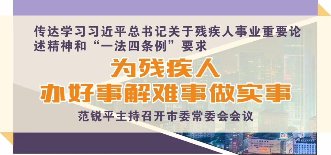 日前,省委常委、市委書記范銳平主持召開市委常委會會議,傳達學習習近平總書記關于殘疾人事業(yè)重要論述精神和“一法四條例”要求。他強調(diào),“一法四條例”是發(fā)展殘疾人事業(yè)、保障殘疾人平等地位、維護殘疾人合法權(quán)益的制度保障。要深入學習貫徹習近平總書記重要講話精神,增強責任感、使命感,帶著感情為殘疾人辦好事、解難事、做實事,扎實做好殘疾人基本民生保障等各項工作,讓他們充分感受到黨和城市的溫暖。