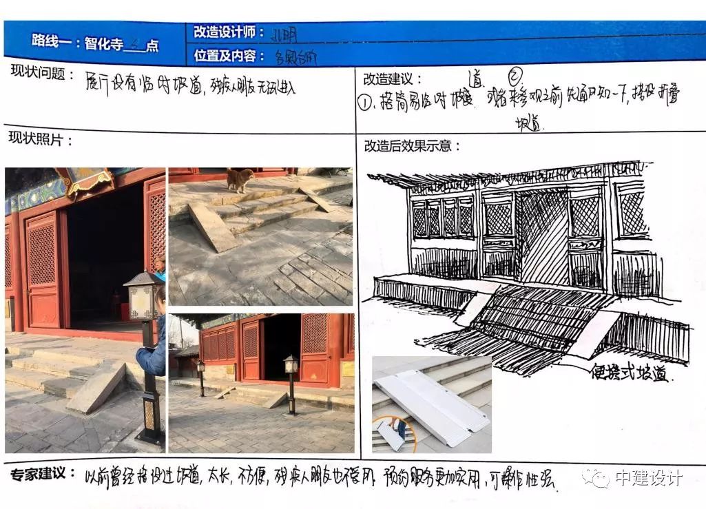 北京胡同和歷史保護建筑的無障礙改造一直是無障礙工作的難點,本次活動以中建設(shè)計集團無障礙研究成果為依托,組織來自建筑、景觀、環(huán)藝等專業(yè)的20名黨員建筑師,針對北京市東城區(qū)祿米倉胡同、智化寺及周邊區(qū)域開展無障礙專題調(diào)研和專項設(shè)計。