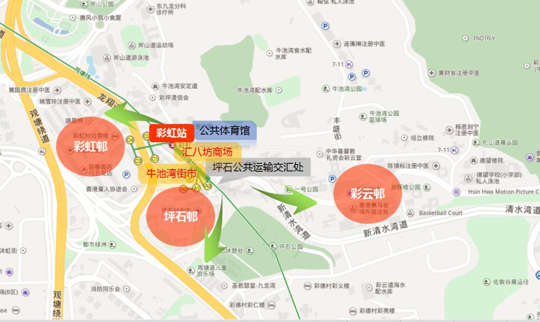 彩虹邨和坪石邨及彩虹站同屬黃大仙區(qū),彩虹站與黃大仙站相距兩站之遙,也是一個典型的“站城一體化”發(fā)展樣板,與黃大仙站發(fā)展理念一致:以地鐵站為中心,周圍布局綜合物業(yè),地鐵站上蓋為“匯八坊”大型綜合商業(yè)大樓,樓內一二層為“坪石公共運輸交匯處”,設有巴士總站、小巴站、的士站和上下客處。