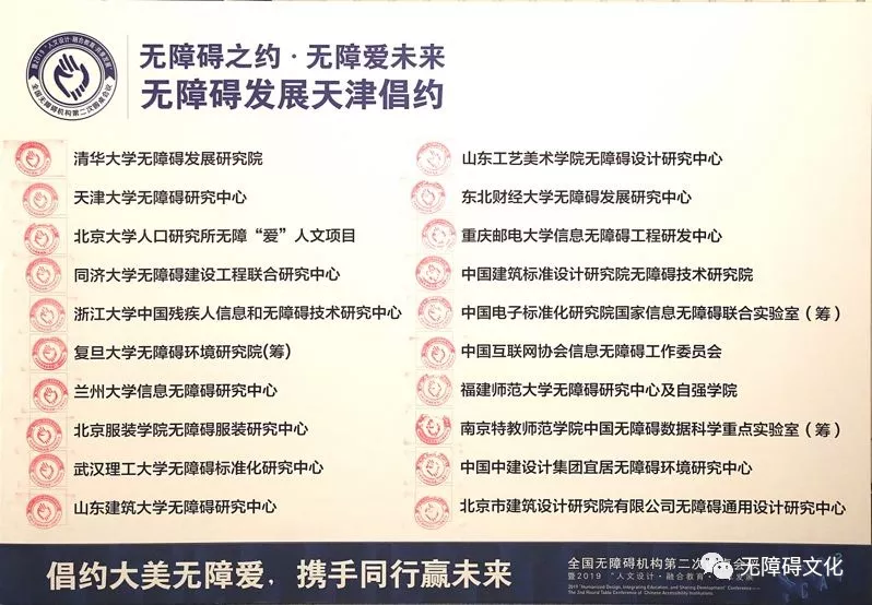 2019年3月27日,天津大學舉辦全國無障礙機構(gòu)第二次圓桌會議暨2019“人文設計?融合教育?共享發(fā)展"會議,來自全國高校、科研、行業(yè)、企業(yè)和社會組織的80余家機構(gòu)參加會議,會議發(fā)出“無障礙之約無障愛未來”《無障礙發(fā)展天津倡約》,與會20家機構(gòu)代表在蓋章簽約,這是《無障礙發(fā)展〈北京宣言〉》的落地實施,是對建立行業(yè)無障礙專業(yè)預審、認證、監(jiān)督、驗收和處罰機制,從設計源頭上保證無障礙建設系統(tǒng)完整、高標高質(zhì)建設的愿景的最好回應。