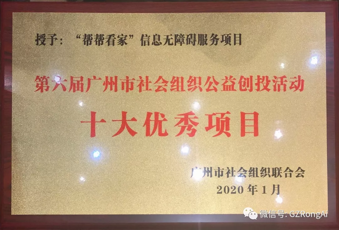 廣州市融愛社會服務(wù)中心的““幫幫看家”信息無障礙項目”榮獲第六屆廣州市社會組織公益創(chuàng)投活動“十大優(yōu)秀項目”。