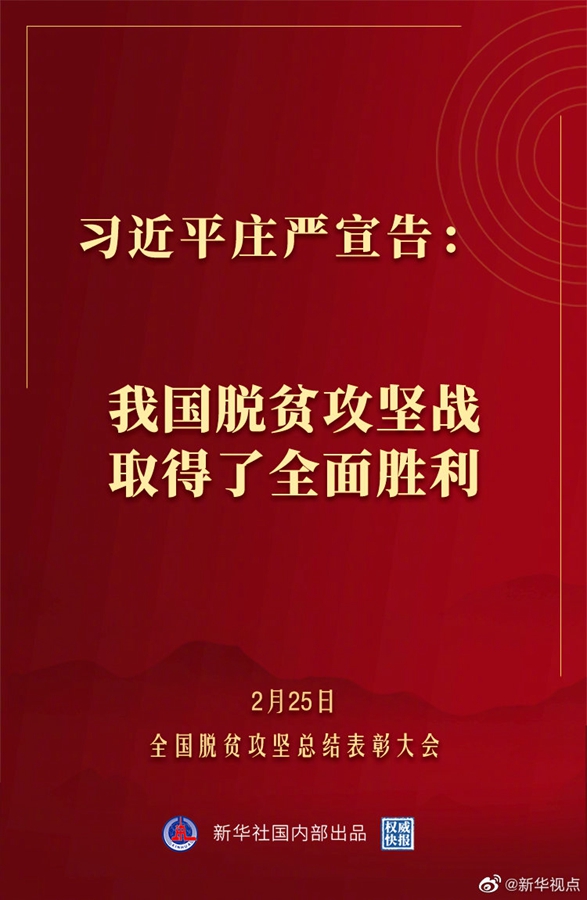 習(xí)近平在全國脫貧攻堅總結(jié)表彰大會上發(fā)表重要講話,莊嚴(yán)宣告,經(jīng)過全黨全國各族人民共同努力,在迎來中國共產(chǎn)黨成立一百周年的重要時刻,我國脫貧攻堅戰(zhàn)取得了全面勝利,現(xiàn)行標(biāo)準(zhǔn)下9899萬農(nóng)村貧困人口全部脫貧,832個貧困縣全部摘帽,12.8萬個貧困村全部出列,區(qū)域性整體貧困得到解決,完成了消除絕對貧困的艱巨任務(wù),創(chuàng)造了又一個彪炳史冊的人間奇跡!這是中國人民的偉大光榮,是中國共產(chǎn)黨的偉大光榮,是中華民族的偉大光榮!