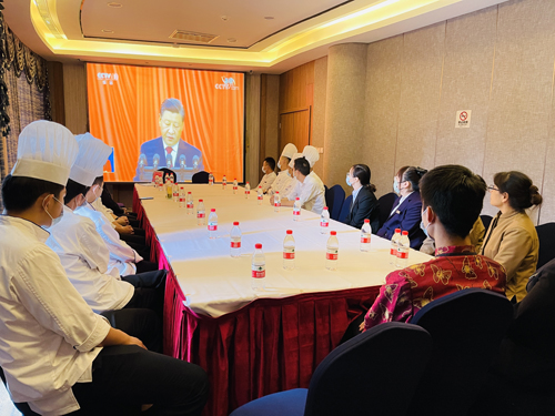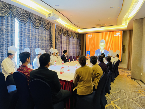 上海諾寶二樓會(huì)議室的投影屏上顯示的“上海諾寶喜迎二十大勝利召開”主題畫面十分醒目。上午十點(diǎn)整,在公司上班的部分干部職工準(zhǔn)時(shí)收看了二十大開幕會(huì)盛況。休息在家的黨員群眾在家里觀看了電視直播,在康體、酒店前臺(tái),不能離開工作崗位的員工們收聽了開幕會(huì)實(shí)況。