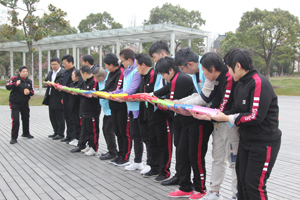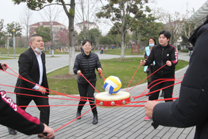 志愿者和學員們一起開展了“同舟共濟齊擊鼓”、“珠行萬里”團隊項目。“同舟共濟齊擊鼓”,要求參與者每人牽拉一根鼓上的繩子,將一個排球放在鼓面上,同心協(xié)力,創(chuàng)造盡可能多的顛球記錄。志愿者和學員們躍躍欲試,隨著開始口令,大家一起拉繩,有節(jié)奏地把球在鼓面上連續(xù)地顛起。一開始,大家只能連續(xù)顛一兩下,在不斷的磨合中,學員們慢慢找到了竅門,最多能連續(xù)顛十幾下,讓大家感受到了團隊的力量。“珠行萬里”的游戲需要大家用管道將球快速滾到杯子里。中心志愿者和學員們分成了兩隊開展比賽,看誰最先讓球滾入杯子。經(jīng)過三局兩勝的較量,最終學員隊獲得了勝利。
