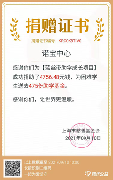 捐款活動開展以來,中心員工們用“愛心匯聚力量,用慈善傳遞溫暖,共計為藍(lán)絲帶助學(xué)成長項目捐款14756.48元,其中以單位名義捐款10000元,以員工個人名義募捐4756.48元,捐款員工達(dá)到306人次