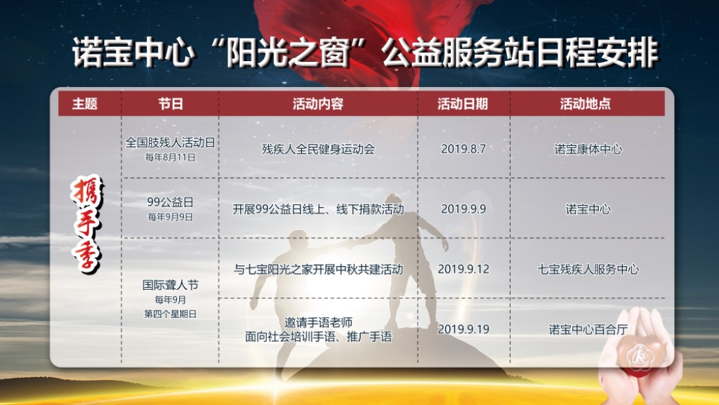 諾寶中心“陽(yáng)光之窗”公益服務(wù)站攜手季日程安排